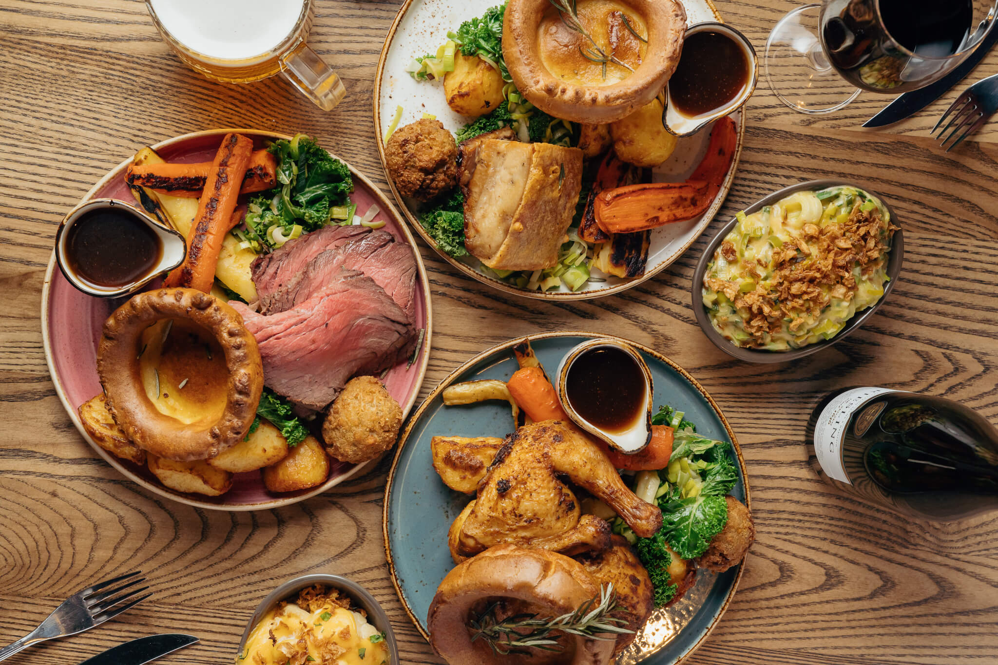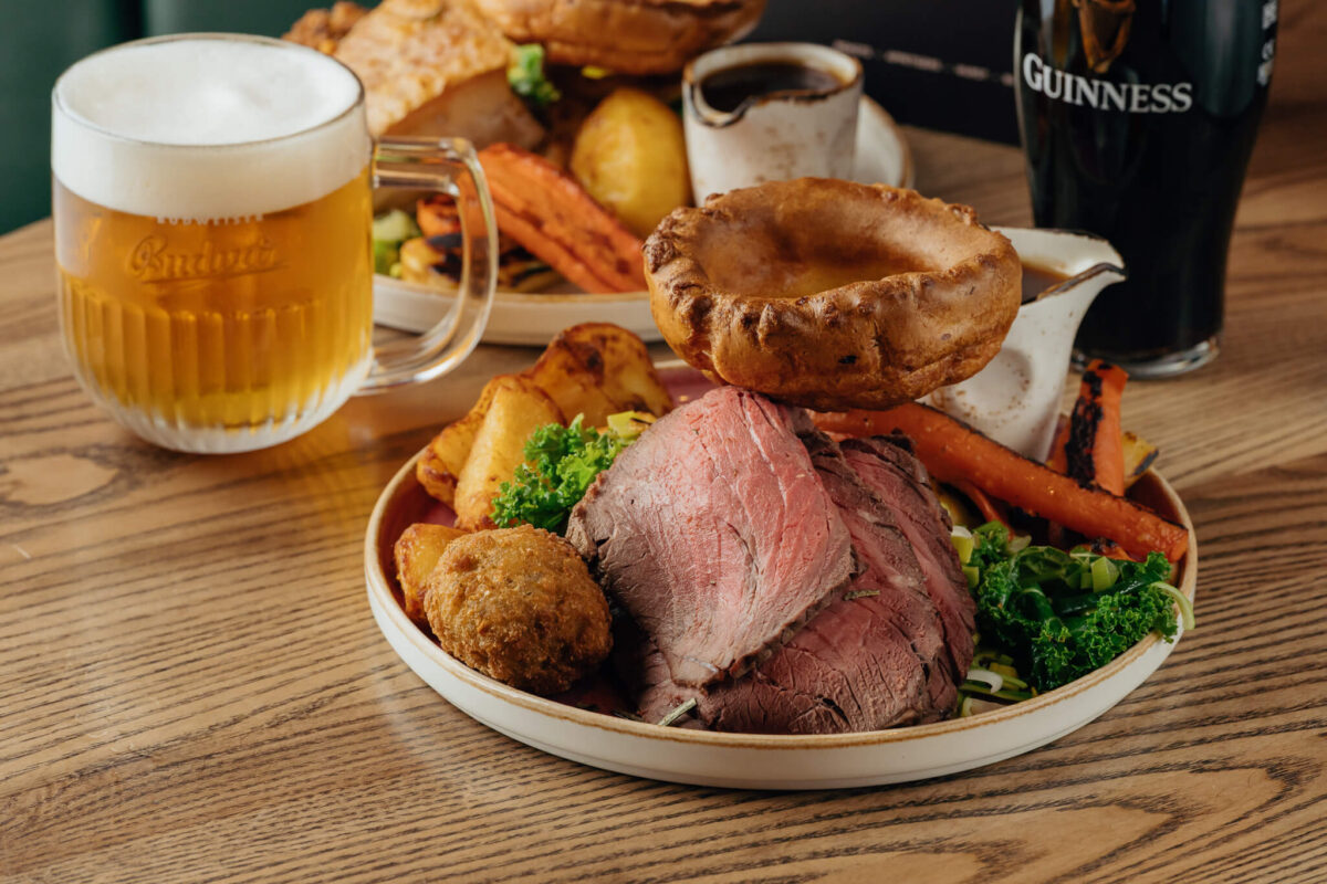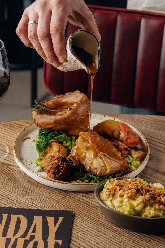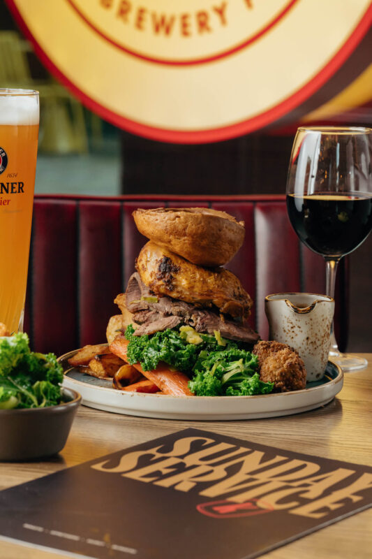 Expect hearty, perfectly carved roasts, piled high with golden garlic and rosemary roasties, baked cheesy leeks, giant Yorkshires & honey-glazed bratwursts wrapped in bacon and all the classic trimmings – all drenched in bottomless gravy.